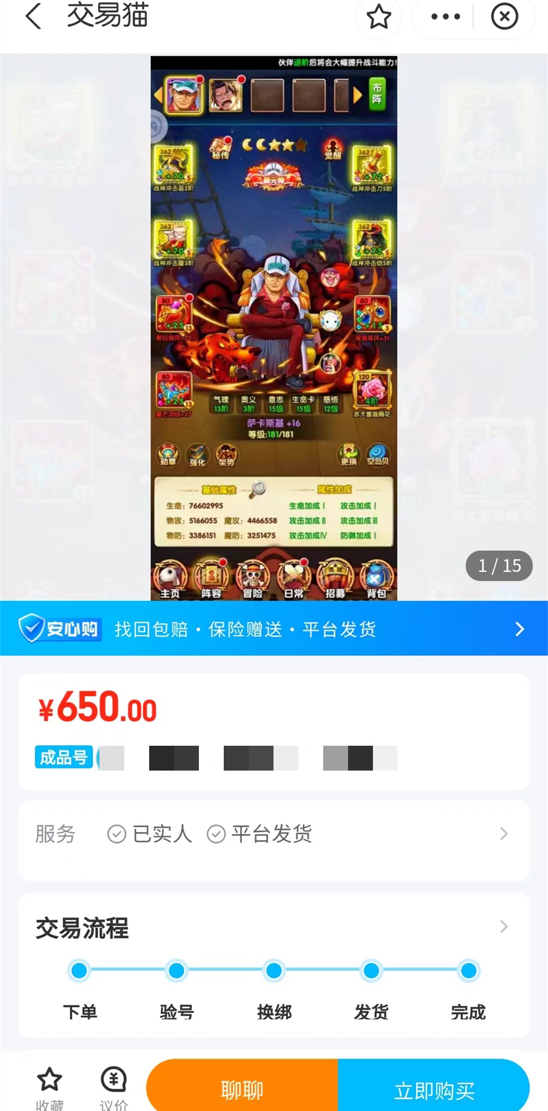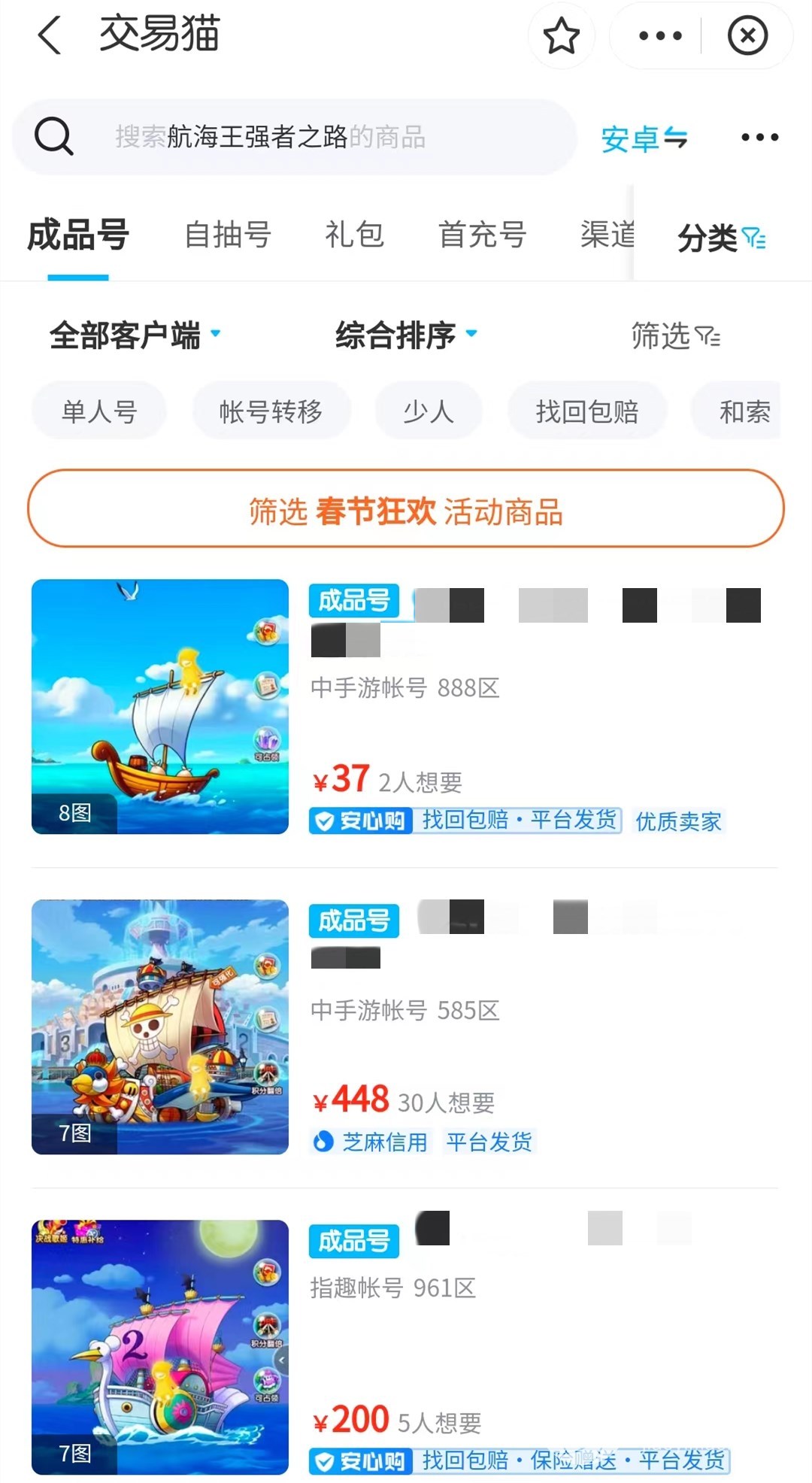 以上就是小编收集到航海王强者之路买号平台推荐的全部信息,虽然在交易猫购买账号可以省不少钱,不过还是需要花的,这就是安心购和找回包赔服务,安心购和找回包赔进针对部分商品,价格略高,但却值得我们进行投资。