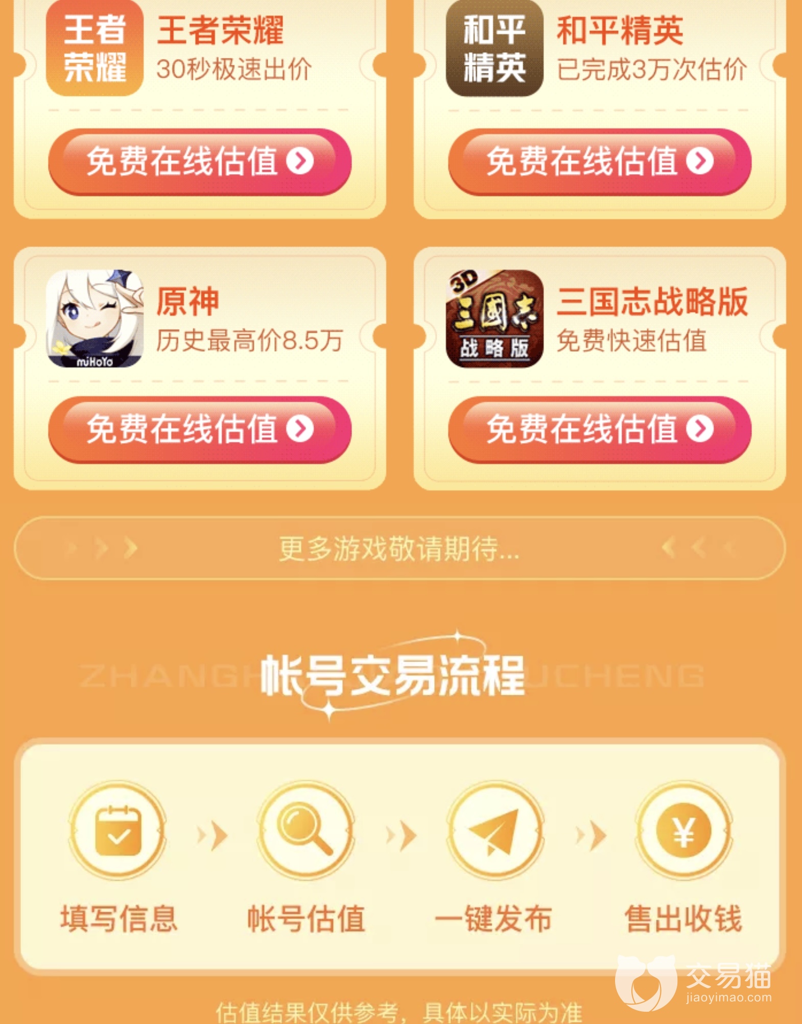 同样是国服账号,每个玩家对自己的账号估值标准都有所差异,因此玩家在决定出售价格时,平台将给予极大的自由,玩家能够按照自己的标准判断账号价值。对于毫无头绪不知道如何估值的玩家,交易猫也奉上了贴心的服务。平台对王者荣耀等热门游戏开设了特色估值系统,按照系统提示是输入账号信息,30s内就能评估出账号大概可出售价格供玩家参考。