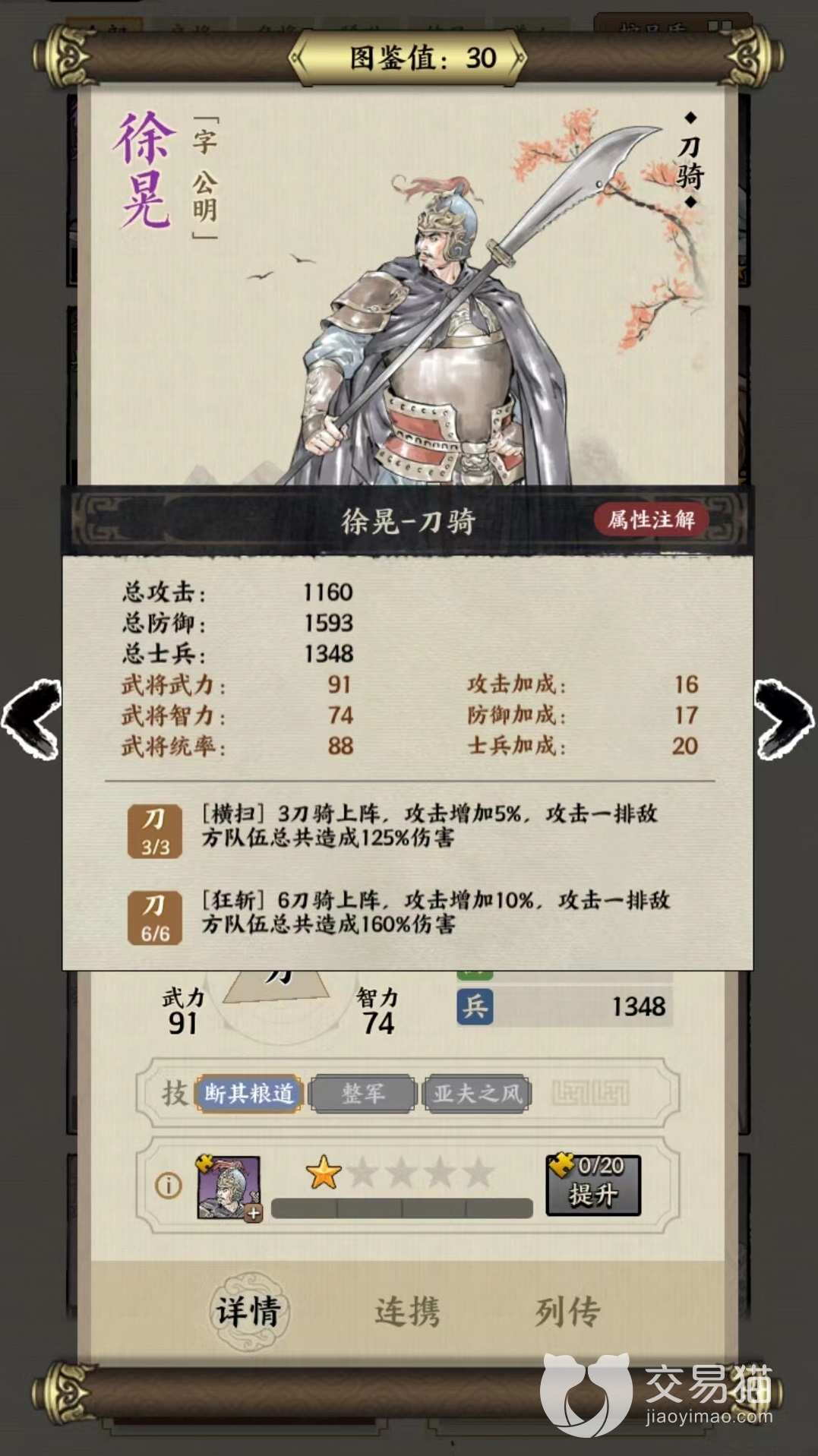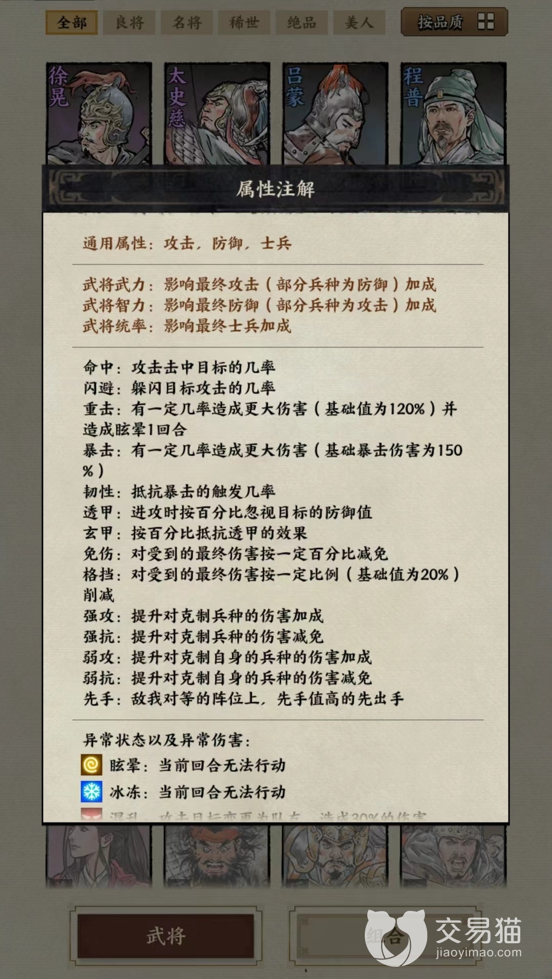 在所有属性中最关键的三个也是最基础的就是攻击、防御和士兵,而影响这三项的是武将自身武力、智力和统率。武力影响最终攻击力,智力影响最终防御加成,统率影响最终士兵加成,对于士兵大家可以理解为其他游戏中的血量。这样对很多卡牌中的元素就有了更深入的了解,接下来是一些更加详细属性划分,包括命中,闪避,重击,暴击,韧性等。