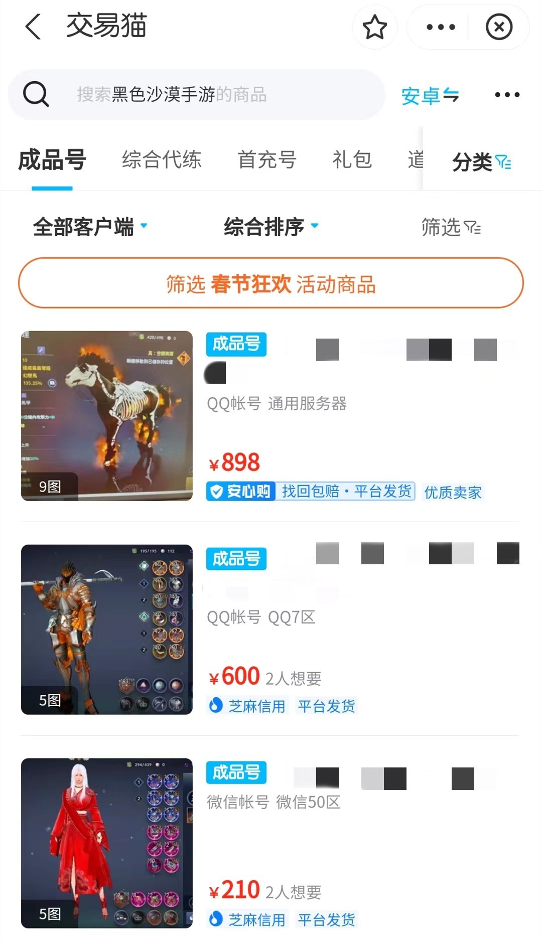 交易猫是一个非常好用的游戏账号交易平台,在交易方面安全公平,保障用户的权益一直都是交易猫平台运行的宗旨;在商品方面,市面上大火的游戏账号基本都可以在交易猫找得到,比如说你想购买一个黑色沙漠账号,在交易猫进行搜索以后就可以看到大量的商品,并且每个商品都有详细的信息介绍。