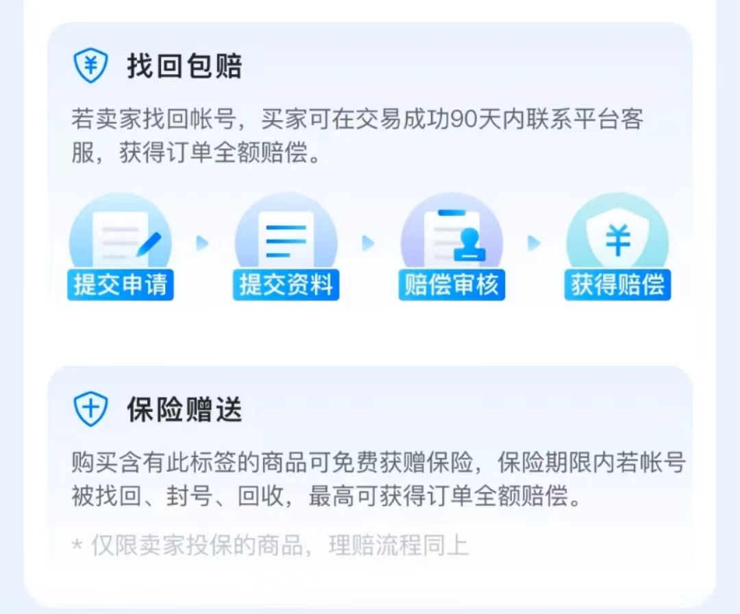 其次,实名认证是必须要完成的,不过小编认为这些还不够,大家可以尽量为自己的账号“镀金”,比如说你可以为你的产品增加保险赠送的服务,或者附加上找回包赔服务,保险赠送和找回包赔都是针对部分产品的,所以作为买家是非常愿意购买有这类标志账号的。