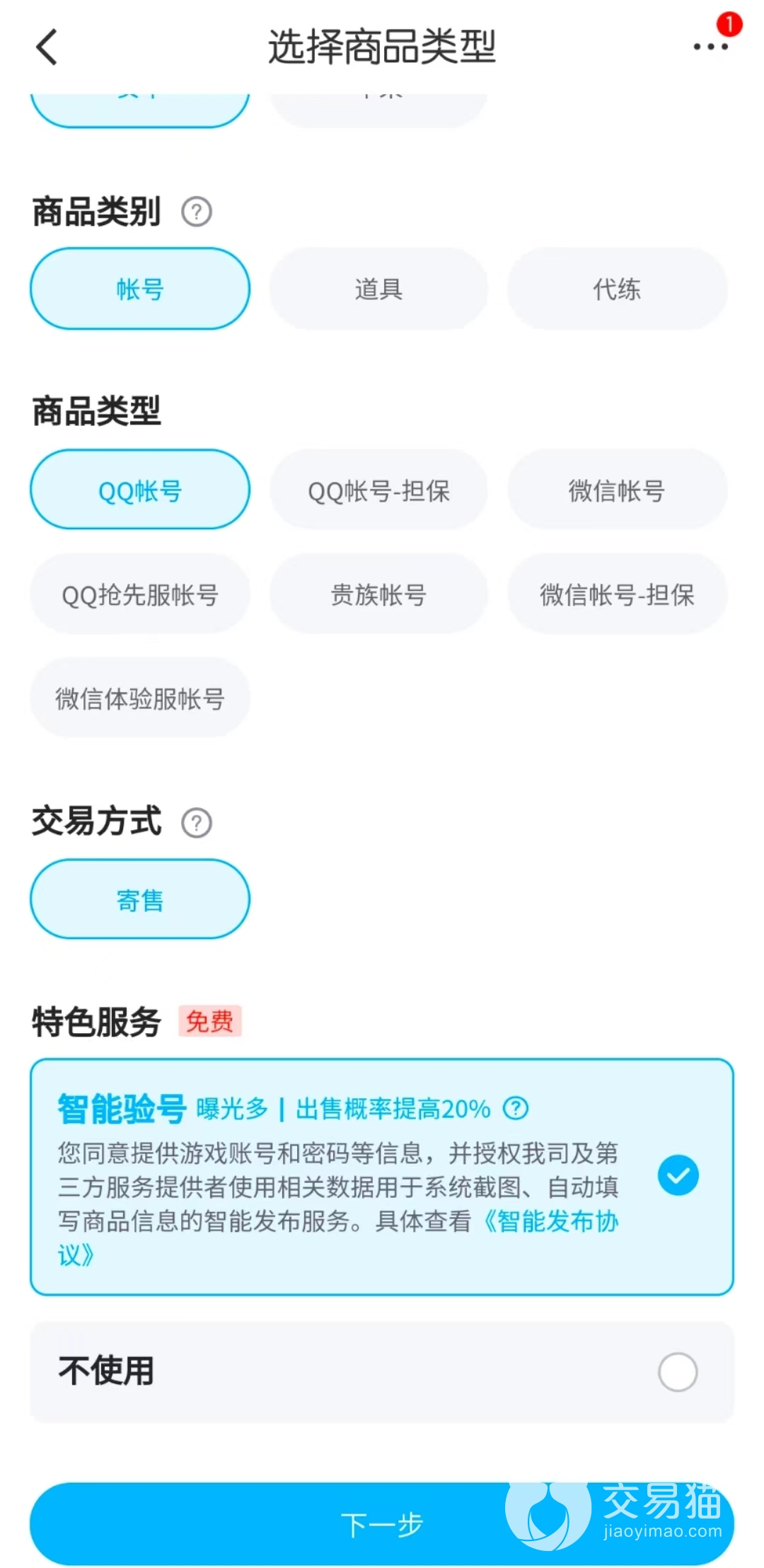 上架商品还是比较简单的,只要根据平台提示就可以快速上架商品了,在选择品上品类型的时候,建议勾选上智能验号选项,这样就可以增加你的账号曝光率,并且商品卖出的概率也会提高20%。