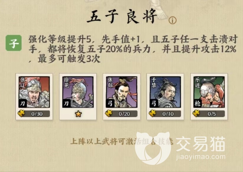 五子良将指的就是在出战卡选择上以魏国阵容的张辽、李典等五子良将作为基础,这些武将既有个体实力上的发挥,在阵容组合方面也有独特效果。首先来了解一下这5张卡牌同时出战时的效果,能够提高强化等级和先手值,只要这5张卡牌中的任意一张能击杀对手,则全体五子良将都将获得兵力上的恢复,而且提高攻击力在同一场战斗中最多可以触发三次。这样就相当于自带了回复效果,能够无限续航战斗下去。