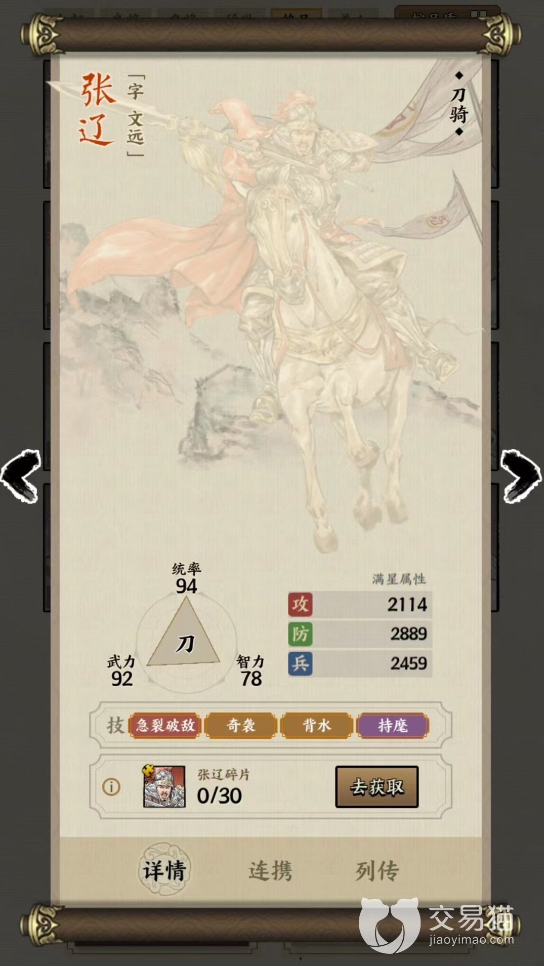 而且这5张卡牌并非全都是顶尖角色,除了张辽是橙色之外,张郃和徐晃都是紫色,于禁属于蓝色,乐进是绿色,这样在成型难度上也会非常简单。张辽主要技能有如果攻击击溃敌人则是其他目标陷入到混乱状态,并且按照双方先手值之差来提高混乱几率,还可以提高相邻队伍和自身的先手值。徐晃特点是攻击之后使目标受到治疗效果降低,并且可以叠加。能够将自身攻击伤害百分比回复士兵生命值,和徐晃同一排的所有单位都能增加反弹远程伤害几率。