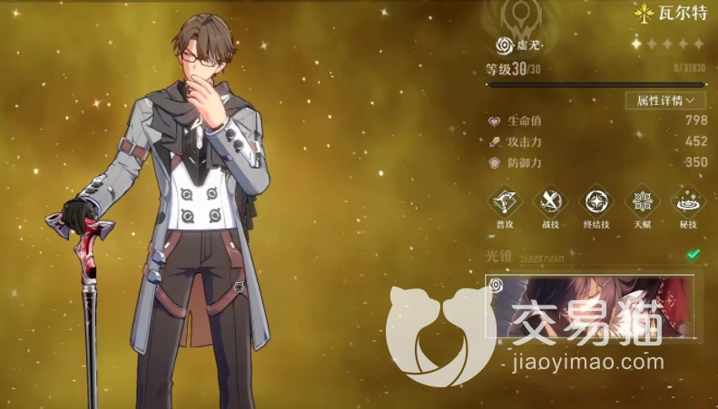 这个角色在基础属性方面看的话,其实并不是很突出,它属于一个虚无角色,等级为30级,不过之后我们也是可以进行突破,在了解其生命、攻击、防御效果之后,我们还可以去了解他的技能,技能才是这个角色输出的根本,在游戏内它属于一个比较强势的攻击型角色,拥有五大技能,其中普攻、战技,终结技都是它的输出技能,天赋以及秘技都是他的辅助技能,可以让我们的实力得到翻倍提升,同时也能让各大攻击效果发挥到极致。