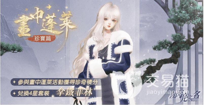 画中蓬莱限定套装。这属于四星服饰,来源于传奇蓬莱故事,来自珍宝篇。它通过福利活动书中蓬莱获得,累积珍奇积分即可。作为靓丽冬装,它深蓝色系优雅气质,羊羔毛大衣保暖效果好,拼接了白色皮毛,华美异常。