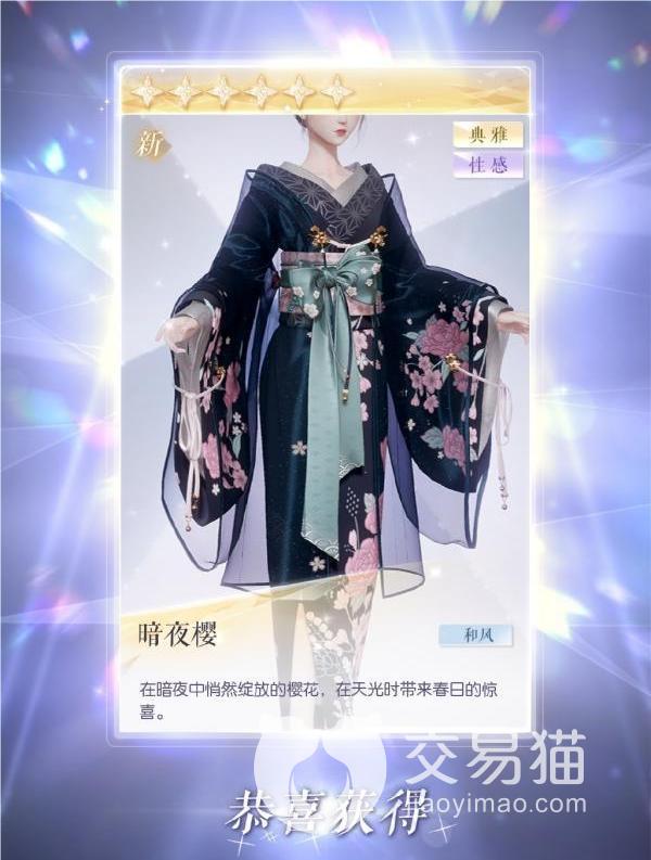 暗夜樱套装六星极品。这是一套暗黑色和服,华丽性感,典雅简约,在袖子、裙摆等位置装饰了粉色樱花,腰间绑上素雅绿色蝴蝶结装饰。这套服饰比较性感妖娆,小清新萝莉妹子不建议尝试。