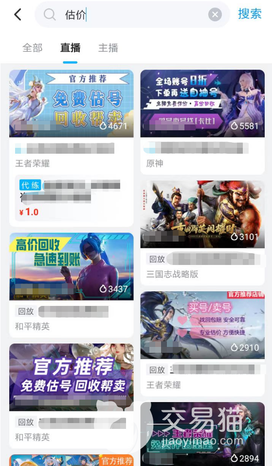 3、如果是第一次开始进行账号交易的玩家,也最好在平台当中进行一次直播估价,主播们会帮助大家的账号内容来进行估值,避免各位太便宜的将自己的游戏号给出售掉。当然,直播专区的内容具有一定随机性,玩家需要时刻关注是否有符合条件的游戏。