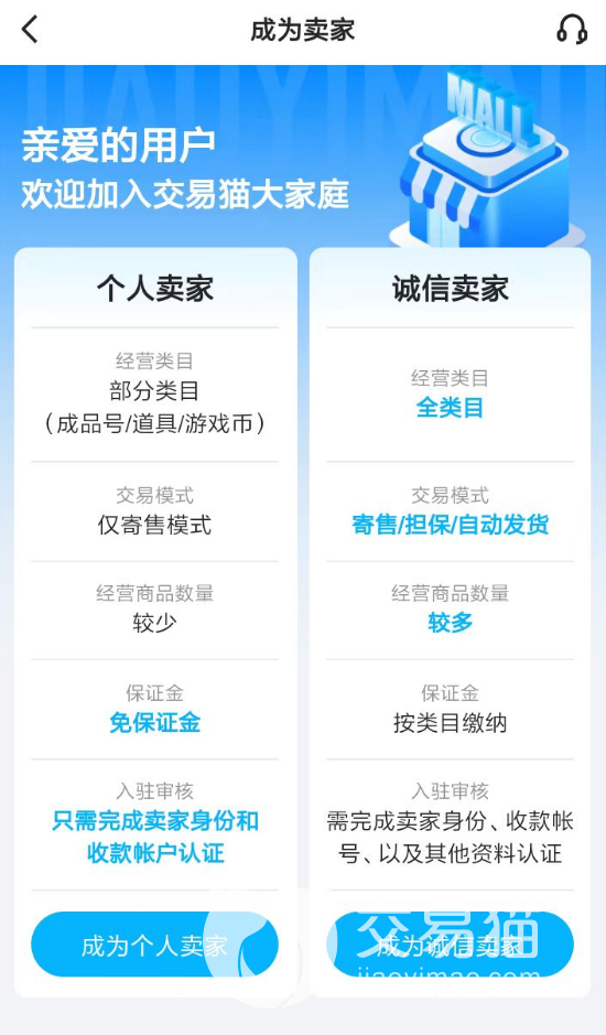 1、平台免费向所有用户都提供了卖家身份的申请,并且大家根据自己出售商品的数量和类型的不同,还可以选择不一样的身份来进行交易。如果玩家只是想要一次性处理掉自己的游戏号,更合适的则是选择一个个人卖家身份即可。