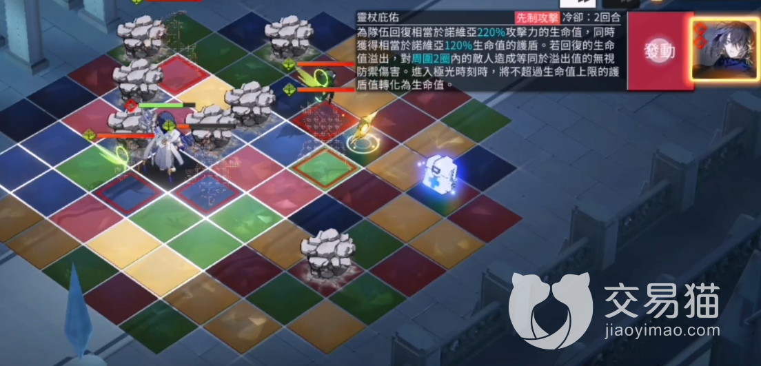 主动技能:给队伍增加220%的HP,同时诺维亚获得90%HP值的护盾。如果回复量超过血量,溢出的治疗会对于12格敌人造成无视防御的伤害,技能冷却时间两回合,突破三星之后变为先制技能。