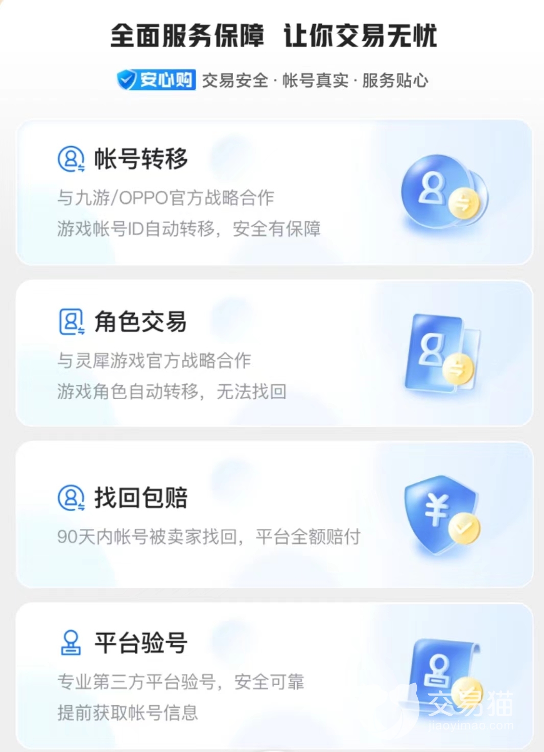 经过多年的摸索,交易猫形成了一套即可以保证买家利益,又方便卖家的交易流程,比起往常的交易模式更加轻松,且对于专业卖家,还提供“自动发货”服务,形成智能化卖号。其中“安心购”和“找回包赔”服务适用于部分商品。