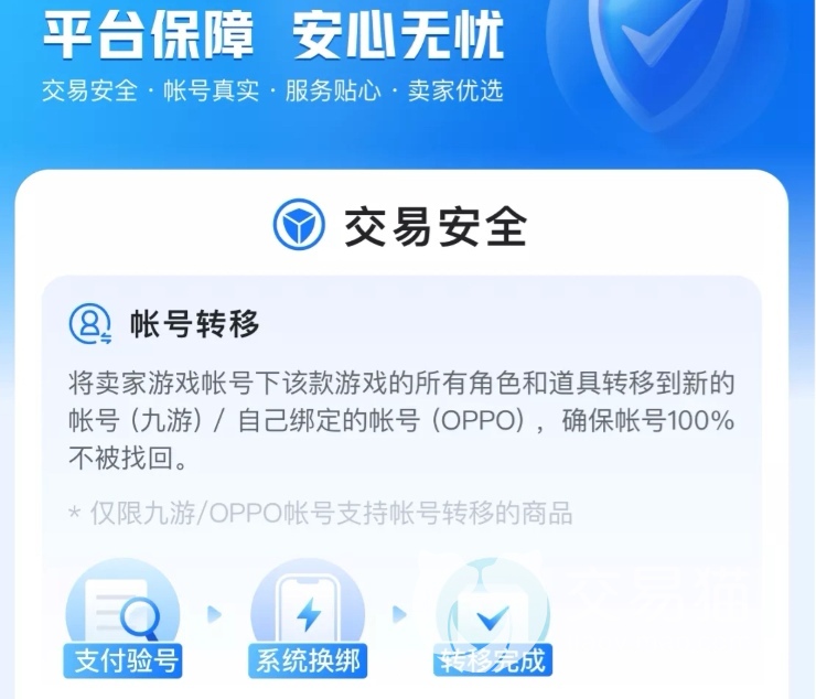 交易猫是可以保护小伙伴们的切身利益。通过多年的摸索,推出了一套流程简单,但过程严谨的方法,可以最大程度的保护买卖双方的合法利益,杜绝宵小之徒以此牟利。