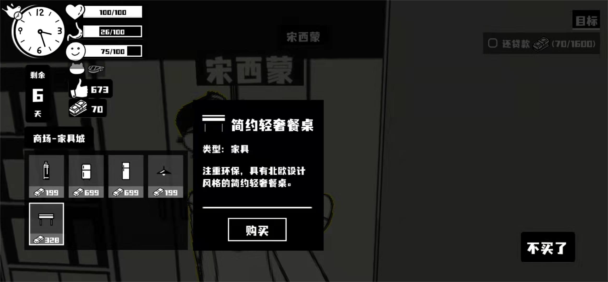 那么关于“荣誉打工人轻奢餐桌如何购买”的内容就讲到这里,游戏里获取家具的方式还是很简单的,只需要前往商场二楼找到电器摊的赵西蒙对话购买即可,但它们的价格普遍都不便宜,需要玩家持之以恒的打工赚取。