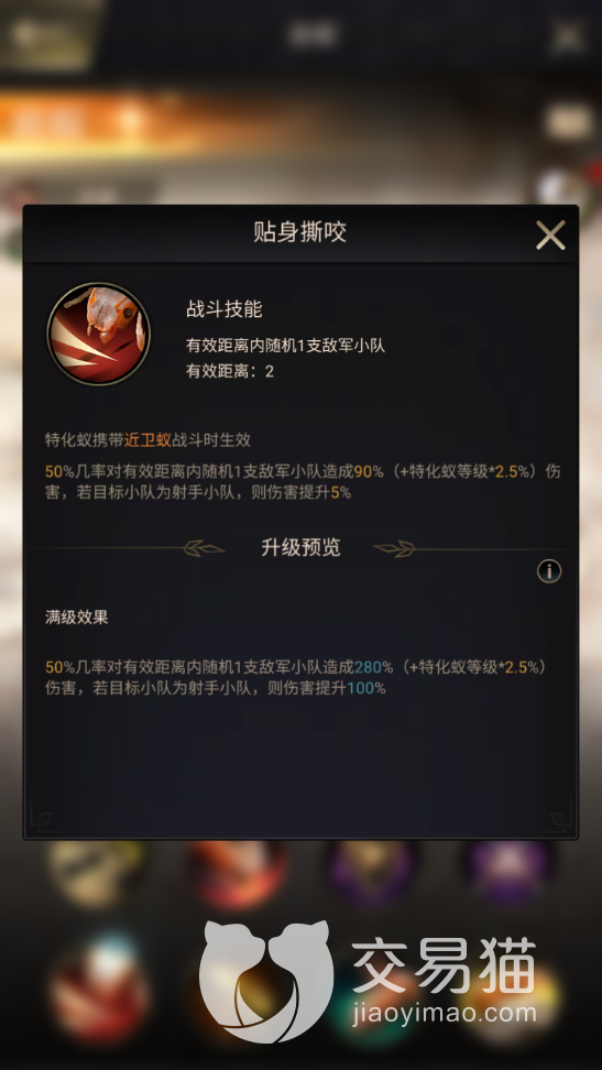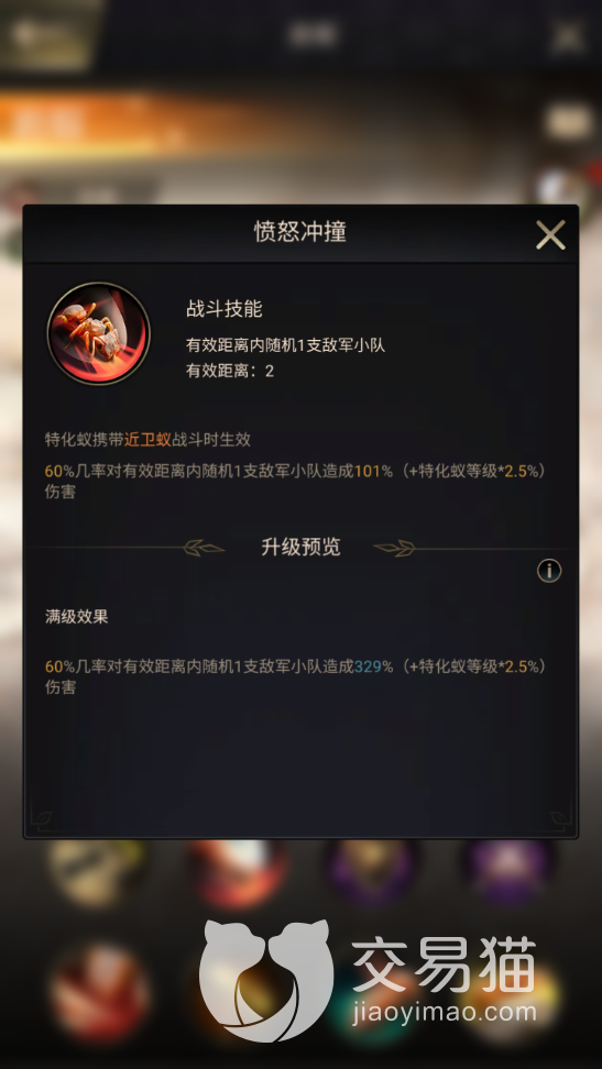 然后再来看看战斗技能本身的效果,首先是“愤怒冲撞”,这个技能升满后有高达329%加成的伤害,而且作用范围是敌人的整只蚂蚁小队,当然,几率虽只有60%,但这在同类蚂蚁中已经算高的了。