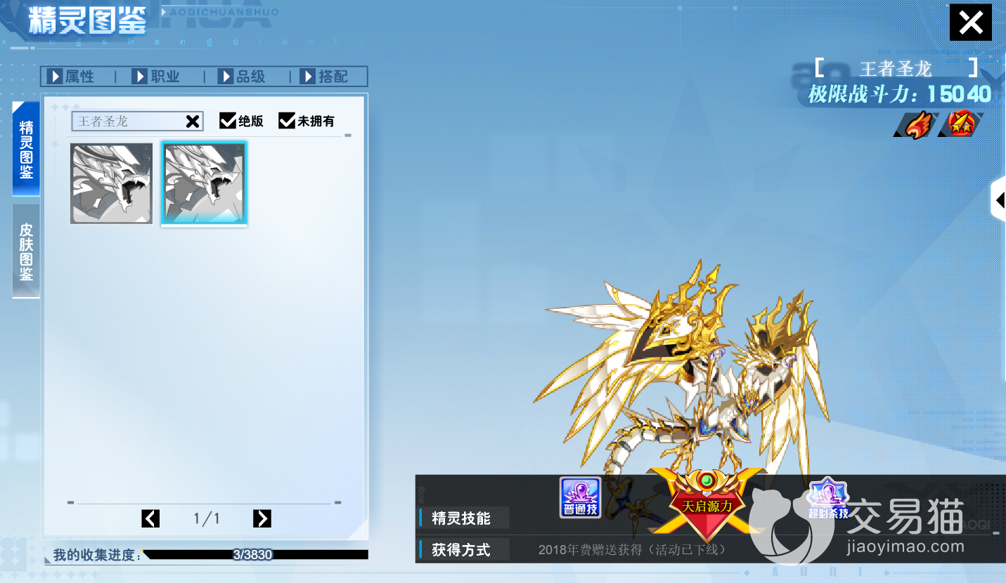 18年:王者圣龙。这是一个可以免疫克制属性伤害的强力精灵,并且每次战斗都能提升巨额属性,必杀更是能制造两个相当于自身80%属性的分身。