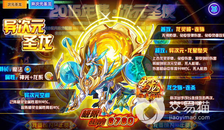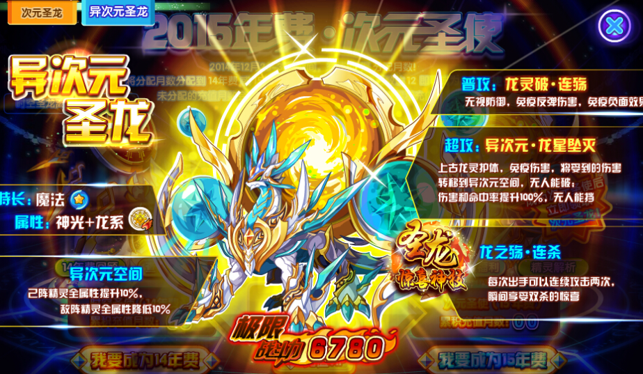 15年:异次元圣龙。同样是无视防御的攻击手段,该神兽还能够免疫能力下降的效果,同时,团队作战时,能增强己方全体属性并降低敌方全体属性。
