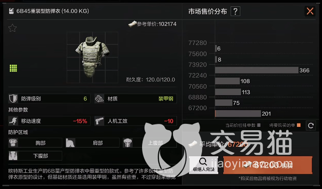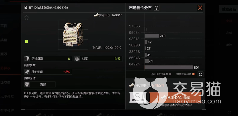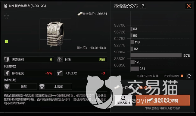 它是六级防弹衣中材质重量最轻的,目前市场价虽然已经达到八万五附近,但考虑其在参数上移速降低的很少,另外也完全没有人机工效的损失,所以整体还算是物有所值,当然,其缺陷也是有的——总耐久度只有100,如果再高一些会更完美。