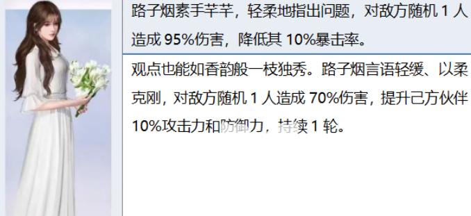 首先是路子烟,立绘为手捧鲜花的白衣少女,非常泛用的增伤拐,可以对敌方造成伤害之后,提升队伍10%的攻击力和防御力。这个提升是百分比提升,基础面板越高加成越大。此外该角色还有一手降低敌人10%的暴击率的效果,适配性非常高,真正的万金油辅助。