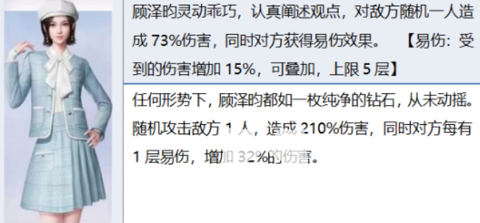 灵巧少女顾泽昀有着非常强的输出能力,当前版本天花板级的强度,这个角色不仅伤害和倍率都不错,还可以叠加易伤buff。易伤简单来说就是能够让敌人受到的伤害不断增加,当达到满层易伤时伤害提升70%。另外一个效果是敌方每有一层易伤,自身增加32%伤害,也就是自身可以叠到160%的,可以说是非常恐怖的数值了。所以这也是目前该角色为什么强的原因,叠满buff直接融化对手。