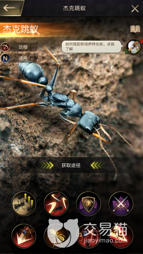 它和射手蚁类似,攻击手段都以远程为主,除了常规的碎片合成和孵化以外,还能通过成长计划和部分活动入手,而且它的兼容性十分强大,三个战斗技能不仅伤害加成奇高,而且还对所带部队的蚂蚁兵种没有要求,另外,它所提供的攻防增益也是不错的。