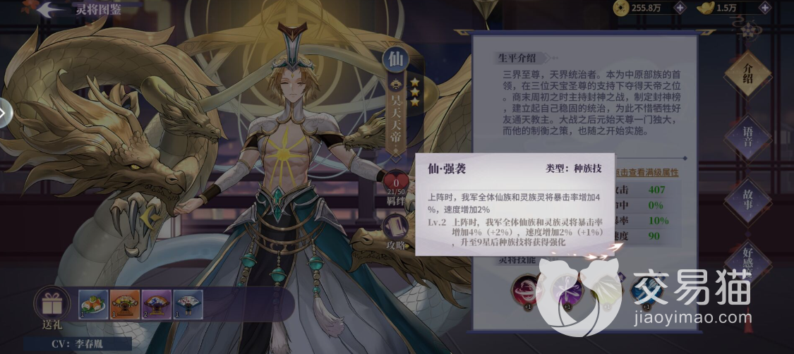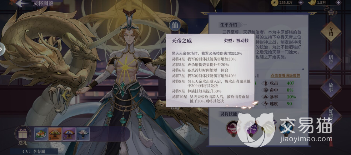 被动方面,一共有两个,一个是天帝之威,除了八星和满星的斩杀效果,其余都是进攻型的辅助效果,不是增伤就是减冷却,几乎适配任何队伍。另外就是仙·强袭这个被动,增加仙族和灵族的暴击和速度,也就是说如果带人族和妖族的角色,就会吃不满被动,所以这个角色还是辅助仙或者灵族的配队比较好。