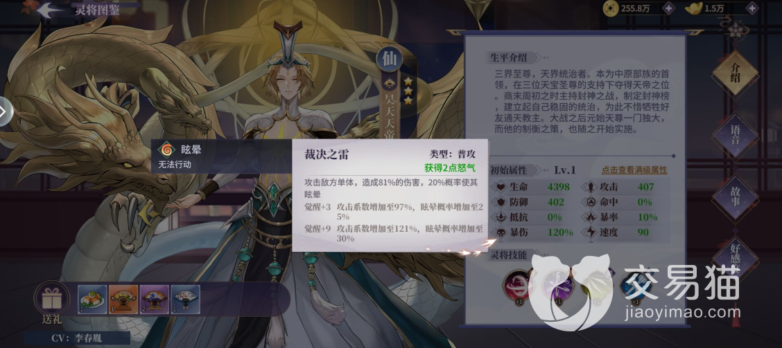 昊天天帝是限时祈愿中获得的人物,是三界至尊,天界的统治者,从背景来历看十分了得。强大的角色不一定是输出,这个角色更偏向于辅助,普通攻击就是一个单体的概率点控,可以用来眩晕敌人,随着觉醒等级的提升会增加几率,最高可以达到30%,对于普攻点控来说非常高了。