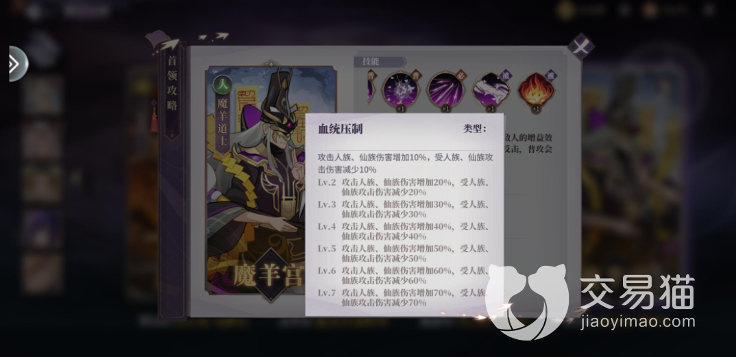 魔羊宫说白了就是挑战首领魔羊道士的一个副本,在目前版本中可以算的上是高难副本了。但如果你只要有套路,其实也非常简单,主要你看这个道士在技能上都是针对人族仙族上,那么很简单这里就直接用灵族,灵族在三大族体系之外,但这个副本的话却是一个“逃课”的方法。