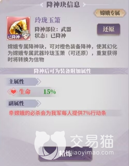 嫦娥的降神玲珑玉箫可以增加自身生命,此外自身的必杀会为所有己方产生7%的行动条,可以说对于加快节奏的话,嫦娥带这个还是非常好的。