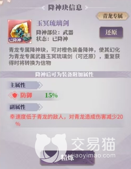 降神玦你可以简单的理解为对应专武类附魔,也就是让橙色武器变为专武,虽然数量众多不好逐个例举,但是可以先介绍几个比较强力的给大家看看。首先是青龙的降神附魔叫玉冥琉璃剑,是一个对于防御有着不错效果的降神玦,提供防御加成之外还会让速度慢于青龙的对手对其伤害减少两成,附魔这个可以说非常能抗伤害了。