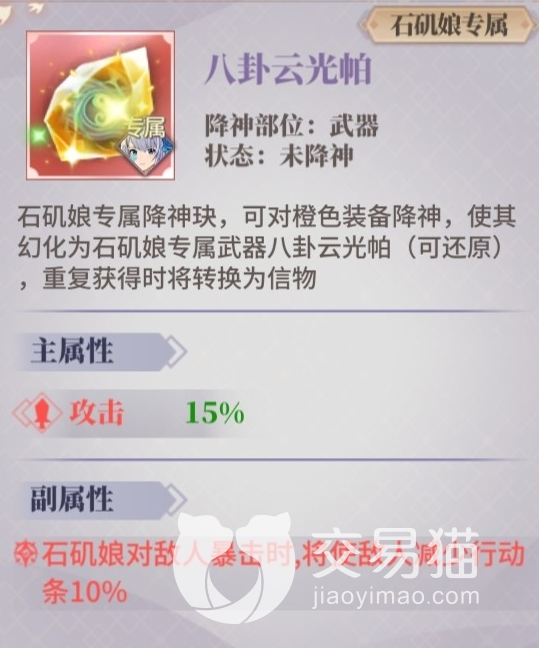 石矶娘的专武八卦云光帕,对自身攻击有着百分比提升,高达15%,并且对敌人暴击时会减少敌人的行动条,其实石矶娘的暴击还是很高的,所以触发起来能不错的减缓敌人的技能频率。