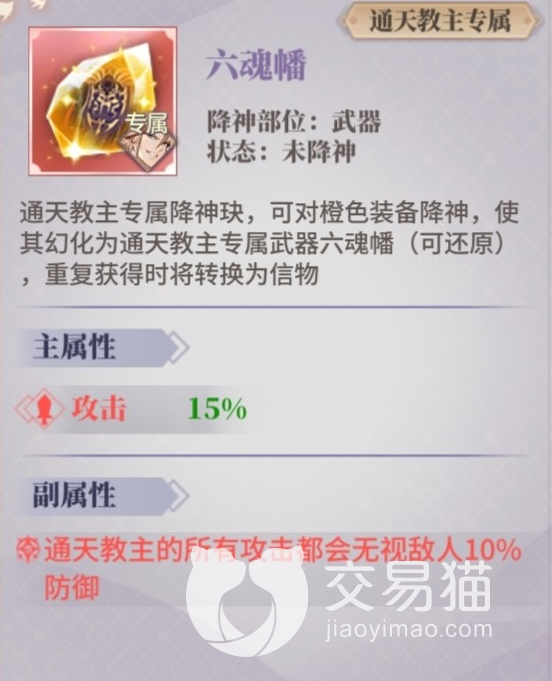 通天教主的六魂幡也是比较亮眼的,可以增加自身15%的攻击力,此外所有攻击都会无视对手10%的防御力,这个所有攻击就包括了技能以及普通攻击,只要角色造成伤害都能享受特效。