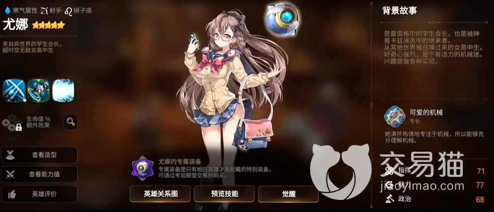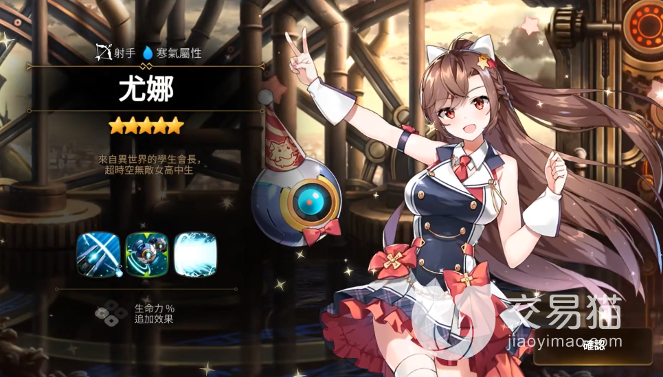 尤娜是一个女性角色,她也有自己的人设,在游戏背景中是一个从其他世界来的女学生,后来被选中作为神兽的结伴人了,个性也是比较鲜明的活泼性格,星级也还不错达到了五星,在技能方面有自己的特长。