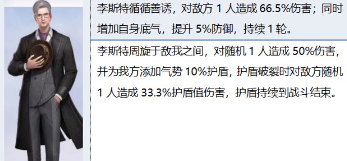 首先是李斯特这个角色,作为开盾工具人泛用性很广,这个角色的盾厚度依靠自己的气势也就是血量来计算,所以只要堆生命就可以,另外在自身的防御伤,他还有一个加防御的技能,盾被打破之后也会随机对敌方一名角色造成伤害,保护队友方面这个角色该做的都能做到。