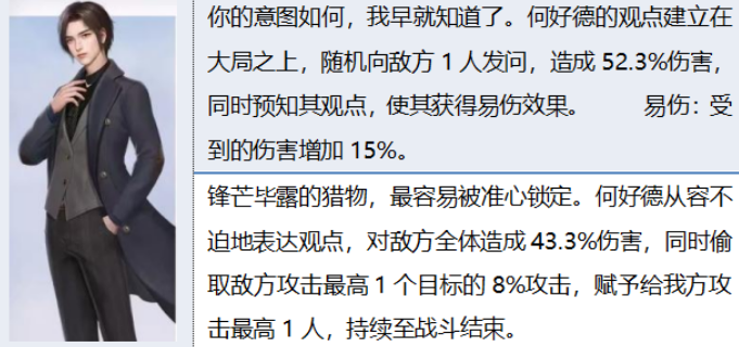 何好德是一个风度翩翩的男性,也是辅助型角色,可以为队友增加易伤,易伤状态下会使敌方受到伤害增加,也就是说这个角色特别适合配合顾泽昀这种靠叠易伤buff的输出,能让其伤害上限再提高一个档次,此外还可以偷取敌方攻击力给自己队友,总体看来只要辅助跟对人,还是非常强的。