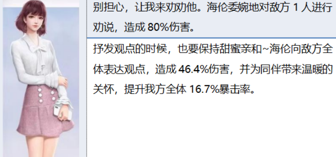 海伦是一位短发打扮的女性,也是一名辅助,从伤害倍率上看是比较拉垮的,所以要让这个角色打输出不太可能,但是她可以为己方全体角色增加暴击率,作为一个暴击拐的话非常合适,对于这类辅助型工具人,练度也不做太多要求,基本上只要带着触发加暴击的技能就很有用。