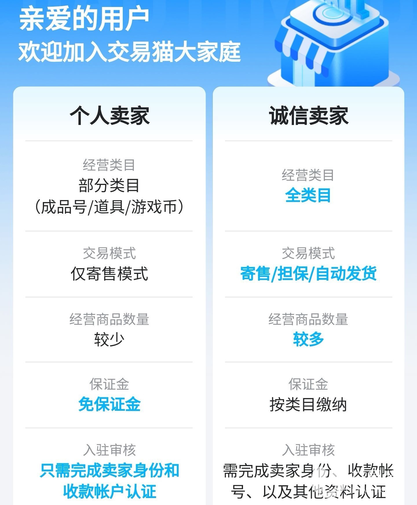 大家都是想在交易猫出售账号的,就卖家这身份也是有差别存在的,有诚信卖家、个人卖家两种,大家也明白诚信卖家更容易出售账号,其实事实就是如此,想更快的出售账号可以去申请,按平台的提示去操作才可以拥有诚信卖家的称号,小编也希望大家能够快速出售自己的账号。