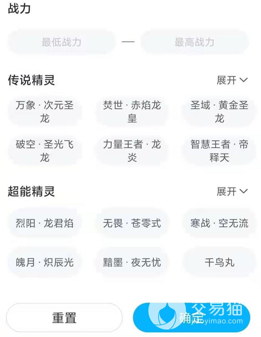 交易猫账号多元仰赖于它多年优良运营能力和海量用户,不同游戏对账号类型都有对应的划分。奥奇传说页游手游有区别,交易猫也对此做出分类。如果大家有特别想要的传说精灵和超能精灵,也可以在筛选里去划点,还有其他账号因素像战力要求、价格高低这些都能自定义筛选。