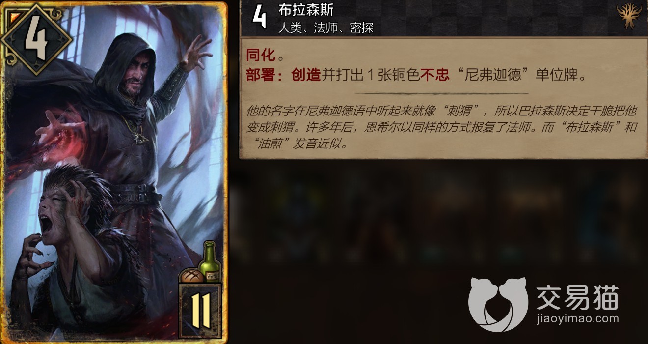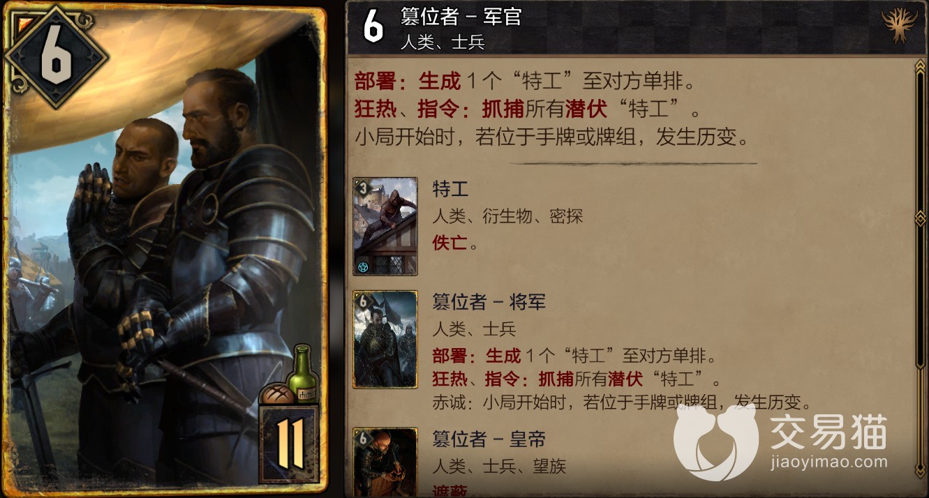尼弗迦德阵营卡牌在原版游戏中就是以外交和阴谋诡计来恶心敌人达成胜利,并且还用势力的能力来强行把平手变成胜利,间谍是尼弗迦德的核心力量之一,擅长敌后搞破坏,和其他阵营正面硬刚或者灵活应战有着明显的区别。而在巫师之昆特牌中继承了阴人的特色,并继续发扬光大,擅长谋略的玩家应该会很喜欢这个阵营。