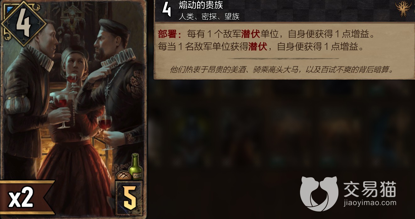 尼弗迦德阵营还有个特点,就是强行把敌人的单位变成潜伏状态,明明不是间谍却胜似间谍,而像煽动的贵族这样的牌,每个敌军潜伏单位都可以增益它,这样就可以用比较低费的状态打出相当高的站场效果,就是比较看前面的铺场,对方场上不管真间谍还是假间谍,只要是潜伏都可以触发。