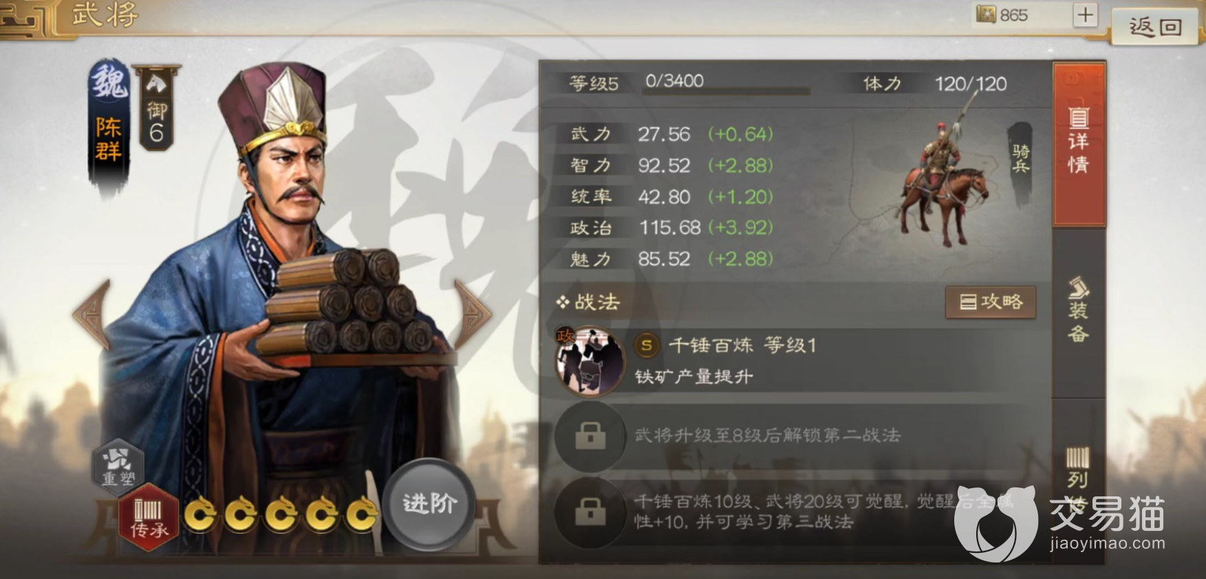 不少玩家好奇三国志战棋版陈群武将介绍,该角色是魏国的内政角色,是游戏当中的金色角色,该角色是骑兵加辅助的设定,很多玩家都不知道抽到这个角色之后将这个角色如何培养,接下来就为大家介绍一下这个角色到底要如何才能发挥这个角色的最大价值,如果你开局抽到这个角色你需要知道以下几点才能让你的游戏玩得更加轻松。