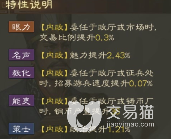 第三点这个角色虽然不善战斗但是在内政方面也算是顶流了,对于氪金玩家帮助比较的大,在市场可以触发眼力增加交易,在内政方面还能提升自己的魅力以及政治,征兵铸币样样精通内政好手名不虚传,当然内政在游戏的后期是玩家实力的最大的支撑,一点点的差距在游戏赛季的后期影响都是不容小觑的,并且玩家城池修建足够高的等级之后各种的职位缺口也是非常的多的,游戏当中强大的武将对于很多玩家来说是不会缺少的,一个好内政官能让玩家游戏的更加快乐轻松。