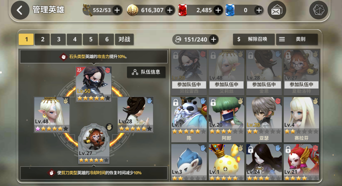 游戏内的职业分为五种,如果想要一个阵容足够稳定的话,那么这五个职业都要拥有,首先第一个肯定要有的就是输出角色,属于队伍中最受欢迎的存在,玩家们可以选择艾斯卡、露西菲尔,这两个英雄培养价值高,最主要的就是后期爆发力极强,就算是前排英雄也可以轻松对付,适合于不同阶段的玩家们去培养,前期后期都是能掌握的。