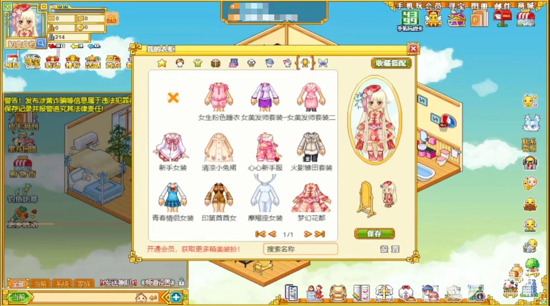 咱们先从平民玩家的衣柜开始翻起,平民玩家的衣柜就显得略显寒酸了。没有氪金过的玩家只有一套新手套装,稍微好看一点。除此之外也就没有特别好看的服装了,还有玩家完成官方会奖励服装的特定任务之后也会获得像样的一整套服装。官方给平民玩家的发型以及服装都好像是围绕着九十年代复古潮流,杀马特以及另类去设计,因此不氪金玩家们穿的衣服就好像是我们小时候人手一件的美羊羊短袖,喜爱但是不好看。