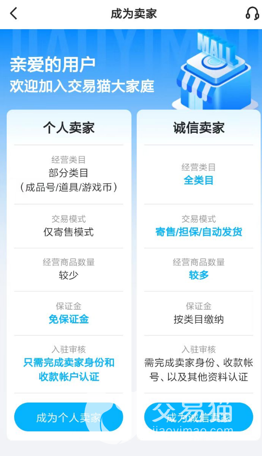 1、目前的平台内,直接为每一个新加入交易猫的用户提供了两个不同的卖家身份。个人卖家可以随时出售包含游戏号在内的基础商品,对于只打算出售账号的玩家来说,认证一个该身份会更方便。而诚信卖家则有着较高的门槛,支持更丰富的商品类型,可以同时上架更多的交易信息。