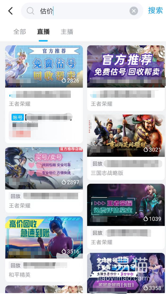 2、如果你刚好在出售游戏号的时候,不知道自己的账号应该填写怎样的交易价格,那么推荐大家没事多关注一下平台当中的直播估价。在这里每一个主播会随机开播不同的游戏,大家可以根据符合条件的直播间来进行游戏号估价。