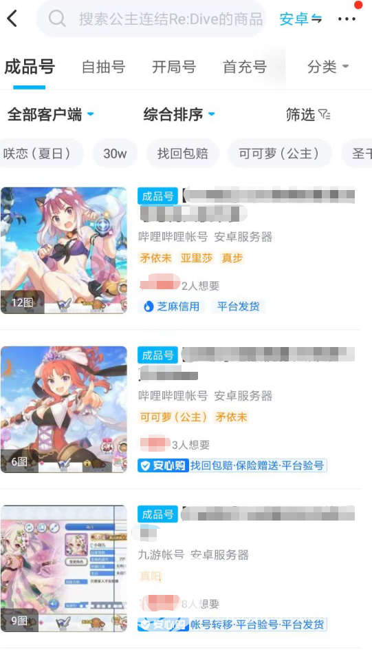 1、在平台当中进入公主连结专区过后,除了大量可以进行交易的商品以外,玩家们在这里也可以了解到,目前包含的账号类型分别为成品号、自抽号、首充和开局号。每一种游戏号都将为大家带来不同阶段的乐趣,想要追求强大战力的玩家,优先去考虑购买跳过了发展阶段的成品号。