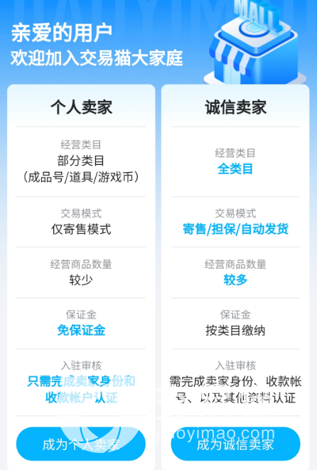 成为一名卖家其实特别简单,远没有想的那么复杂,要是想出售单个商品和个人账号的话,注册成为个人卖家即可,要是出售多个类目不同商品的话,就申请成为诚信卖家,这两种卖家注册手续都相对简单,不过诚信卖家的手续要多一些,但是能享受的福利也多。