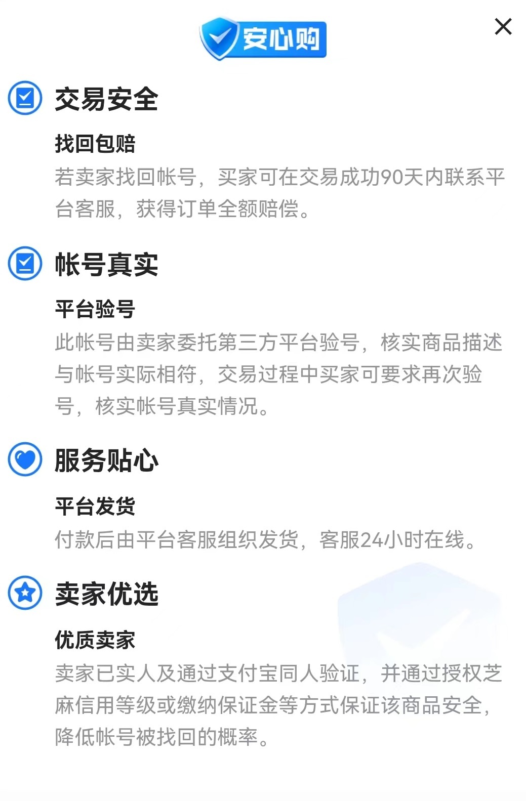 如果对上述所说依然存有疑虑,那么在下单付款时候可以添加上保险,专门针对账号这样的虚拟商品所设置,由知名保险公司承担。一旦出现找回、盗号、封号这些情况,就由保险公司来按照订单金额进行赔偿。也有一些商品出售者为了吸引注意力已经提前购买,好就无需再次添加,如果没有需要自己在下单时候添加上。费用非常优惠,相比于提供的长时间保障,属于非常划算的服务,建议直接买到90天,这样性价比才会更高。