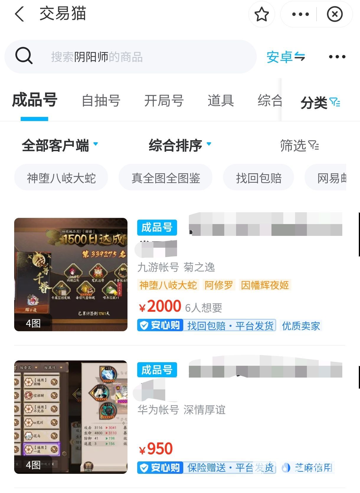 阴阳师的全图鉴账号想必大家都知道其含金量,无数非酋玩家梦寐以求。在交易猫您可以放心的出售您的全图鉴账号,便捷的操作系统也方便卖家自己进行账号价格的相关估计,并且可以快速注册成为卖家,经过认证成为更加吸引买家的高信用卖家。