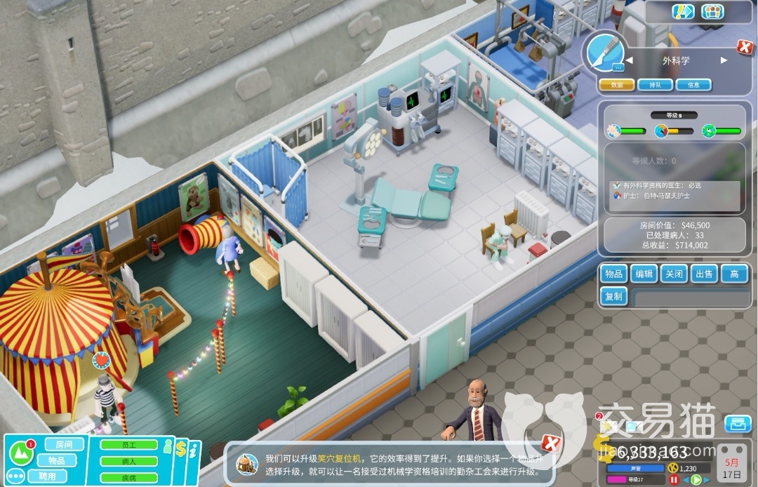 处理好科室排布的问题后,玩家就要着手解决员工的事情啦!要知道如果医院所有工作人员都处于开心状态或者精神焕发状态的话,是能够增加10%的工作效率和治疗诊断率,并且玩家如果要把诊室的等级提到5级的话,还能大幅度提升员工的幸福感,治疗的成功率也是直线上升。